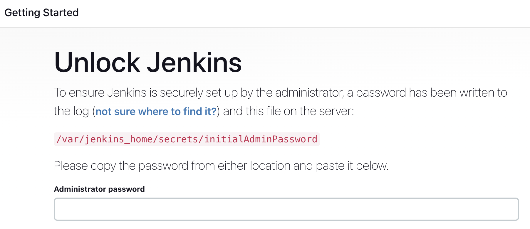 💡 Administrator password는 log또는 파일(/var/jenkins_home/secrets/initialAdminPassword)로 확인 가능합니다.